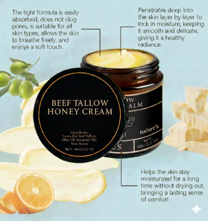 Say hello to deep hydration with our grass-fed beef tallow and raw honey blend. Nourish, protect, and soothe your skin—all in one adorable tin.
